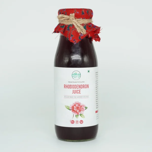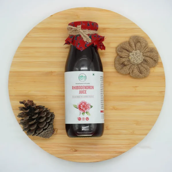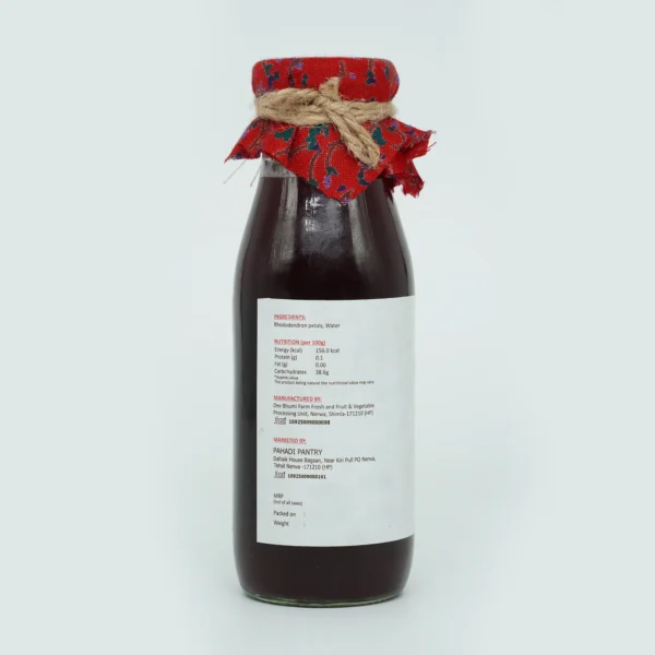 Pahadi Pantry Rhododendron Juice, also known as Buransh Juice, is prepared using carefully selected rhododendron petals and water, following traditional preparation practices from the hills of Himachal Pradesh.